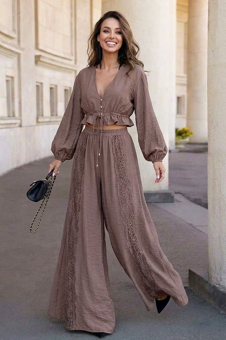 - Bluza ima duljinu crop-topa i spektakularne rukave, a hlače imaju široki dizajn i visoki struk.