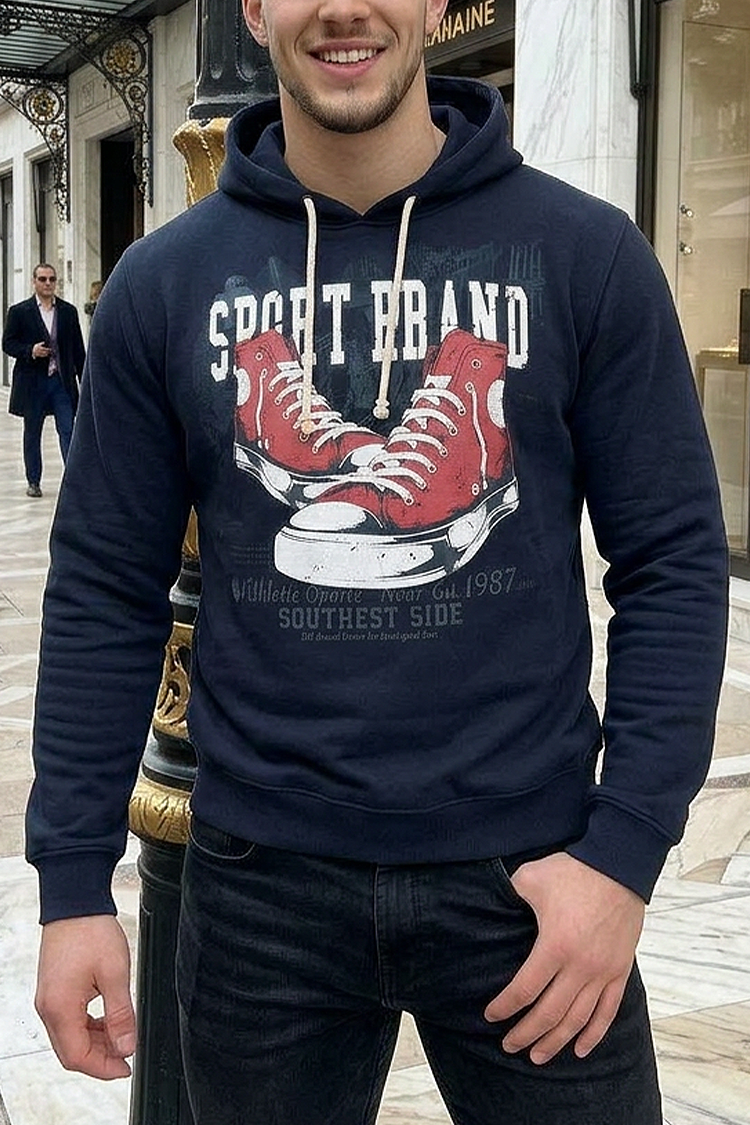 - Udobna i moderna muška dukserica s kapuljačom i džepovima, prikladna za svakodnevni život ili šetnju.