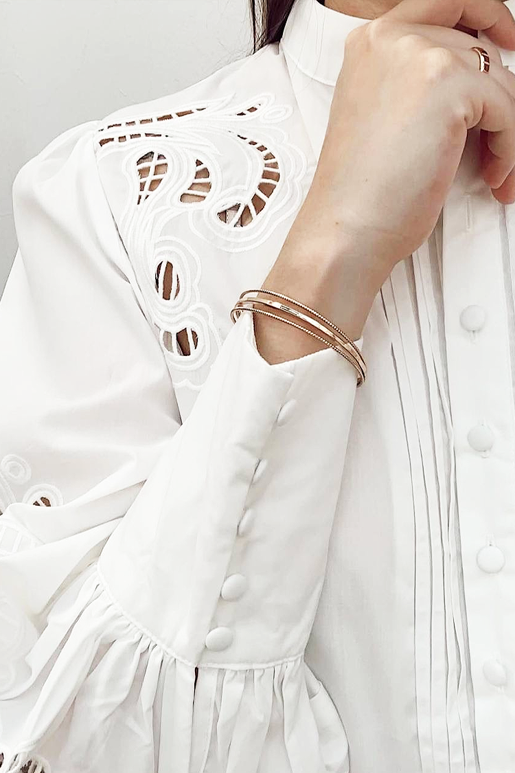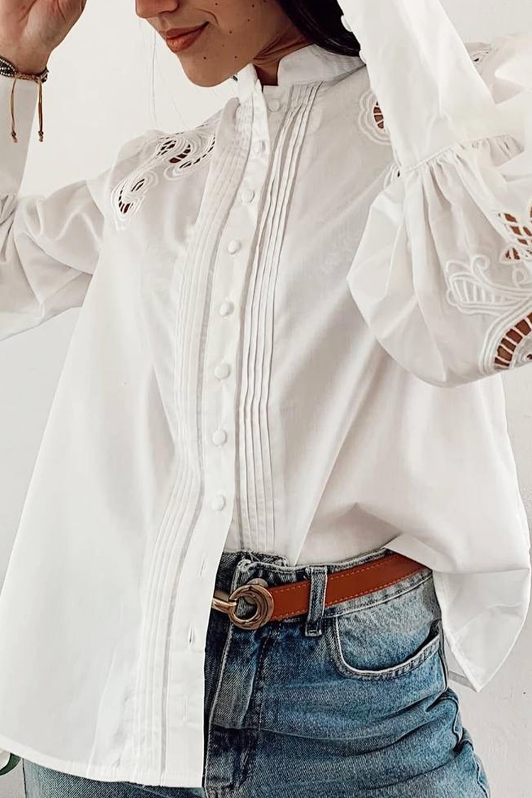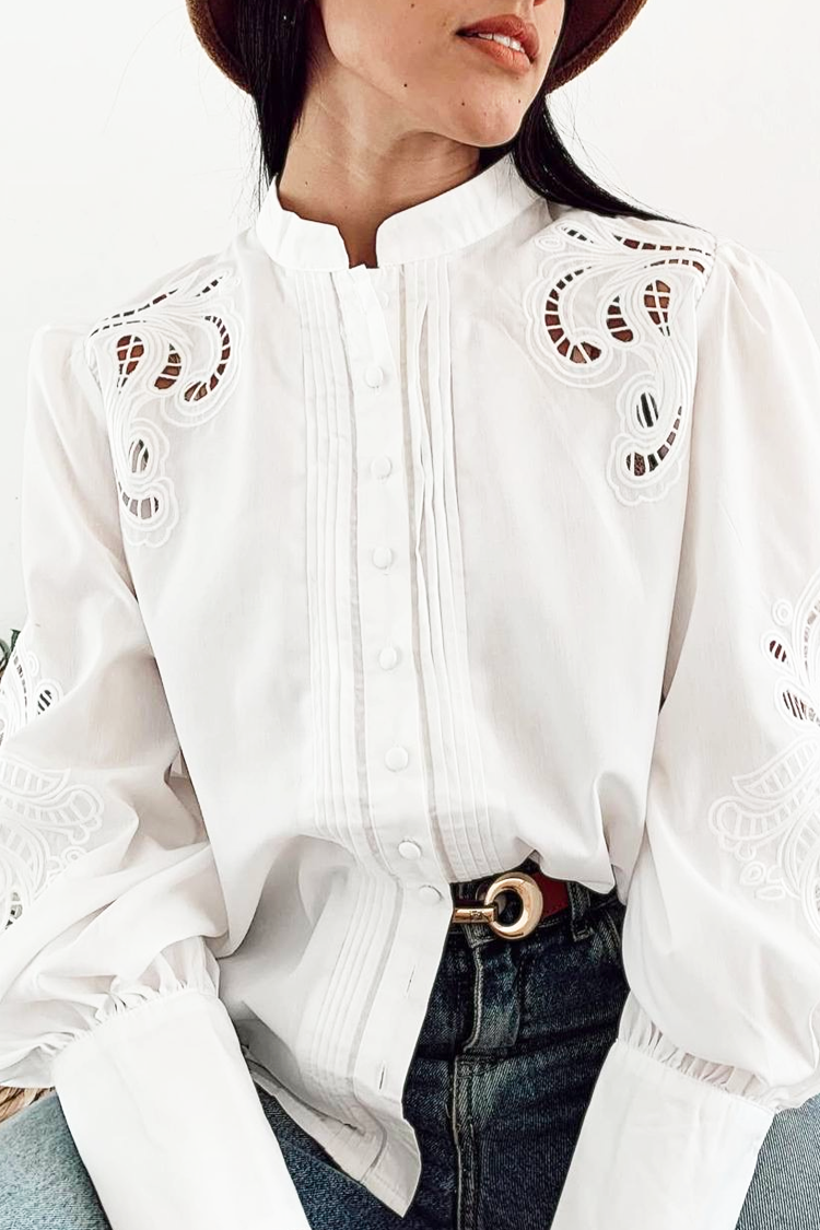 - Model ima gumbe cijelom dužinom, ovratnik, klasičan dizajn i rukave sa spektakularnim vezom.