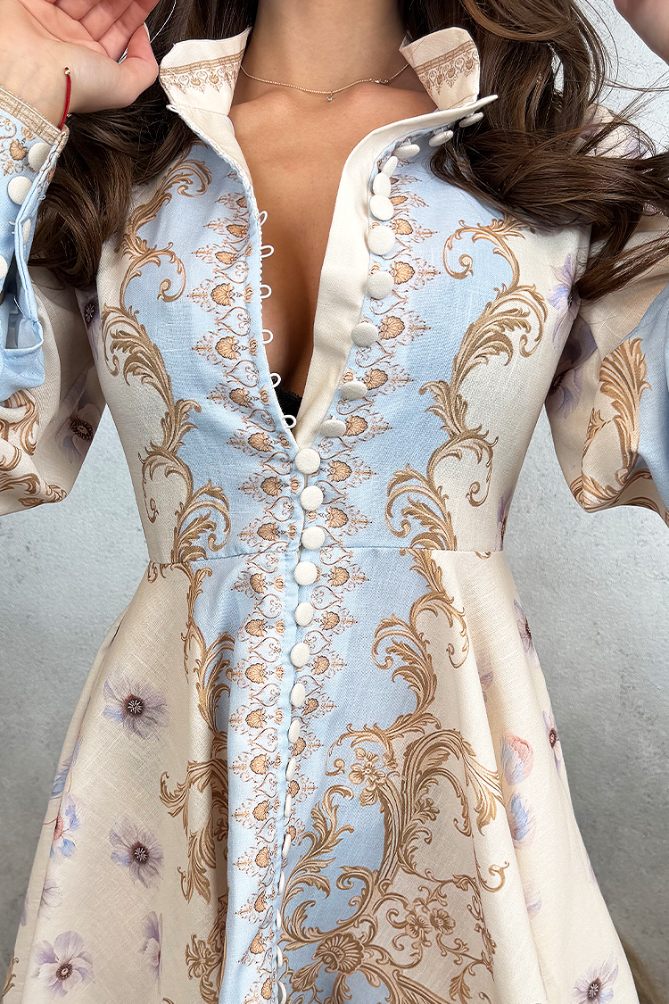 - Haljina ima mini duljinu, gumbe po cijeloj duljini, ovratnik i višebojni uzorak.