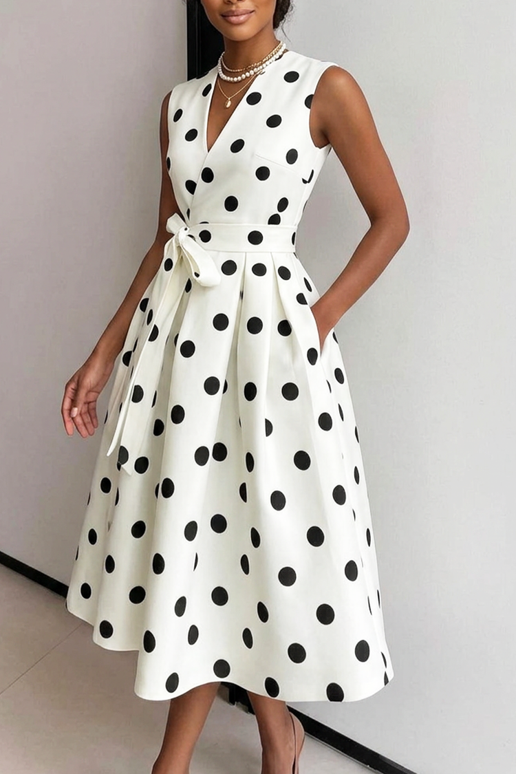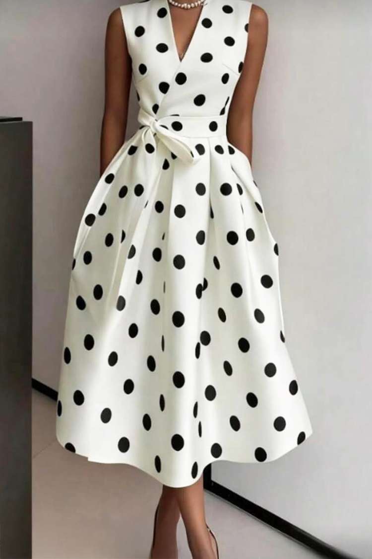 - Model ima koketni kroj, midi duljinu, bijelu boju, V-izrez, točkasti uzorak i džepove.