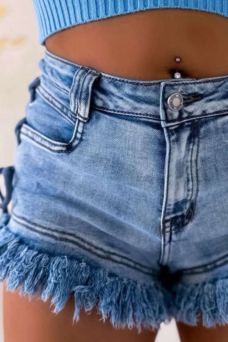 - Osnovni model ženskih kratkih hlača u svijetloplavom uzorku, prikladne za svakodnevni život ili šetnju.
