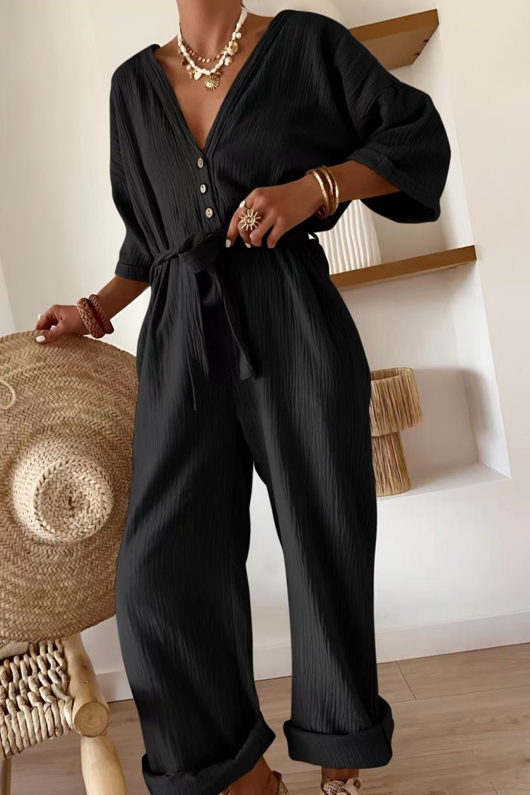 - Model ima udoban kroj, široke nogavice, elegantan dekolte s gumbima i remen u struku.