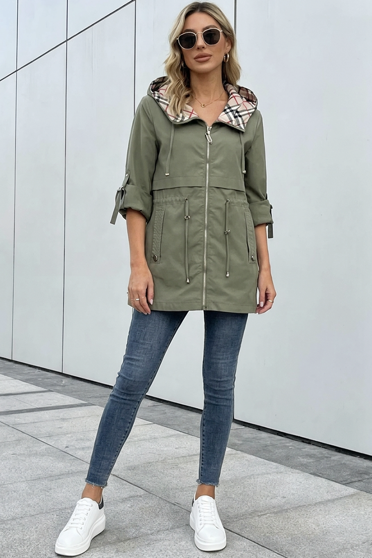 - Model ima kapuljaču, patentni zatvarač cijele duljine sprijeda, bočne džepove i vezice u struku.