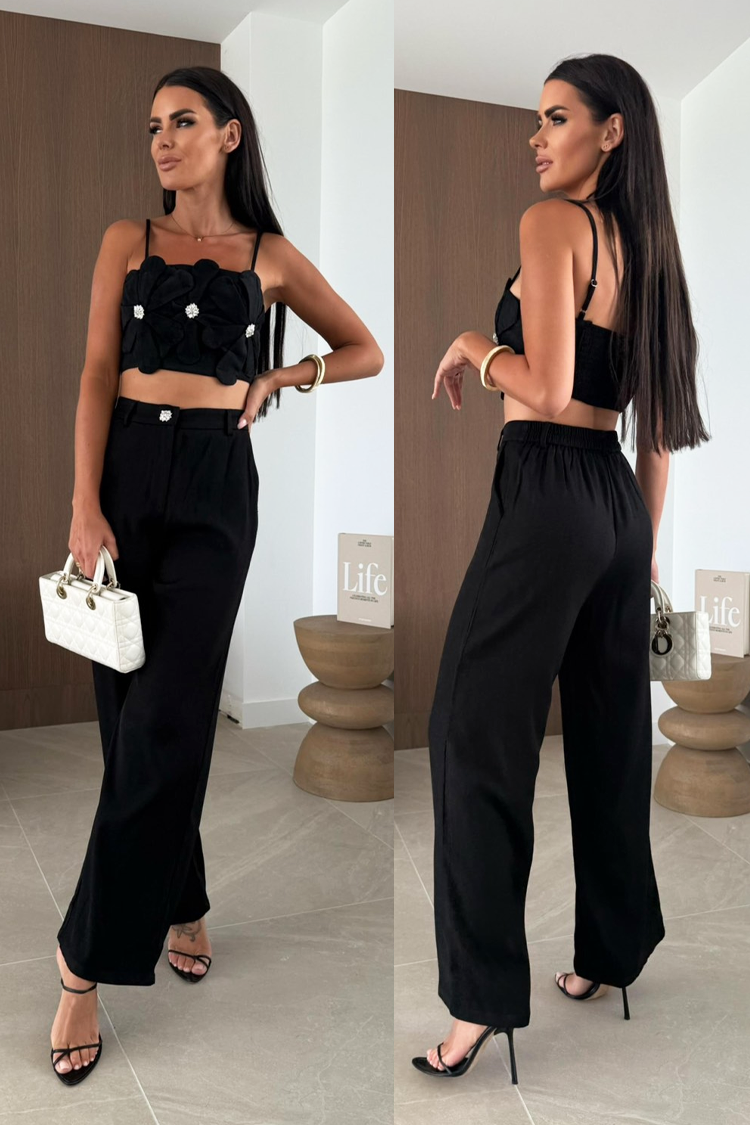 - Gornji dio je crop top sa spektakularnim cvijećem, donji dio su hlače ravnog kroja.