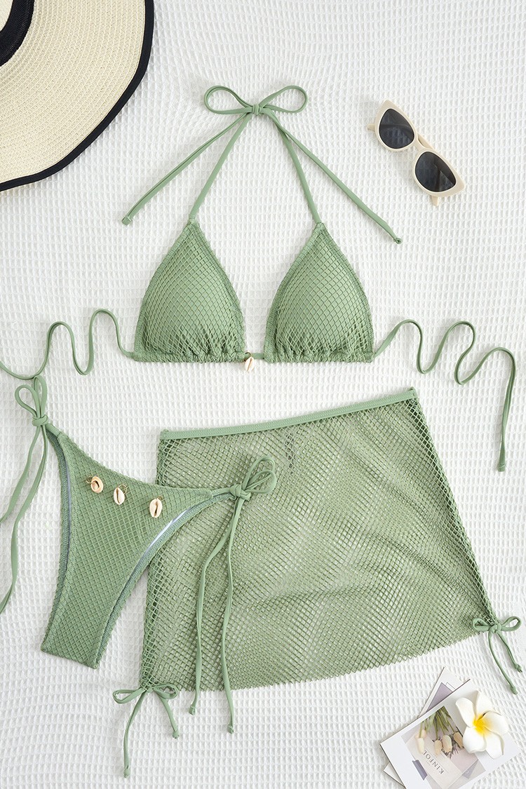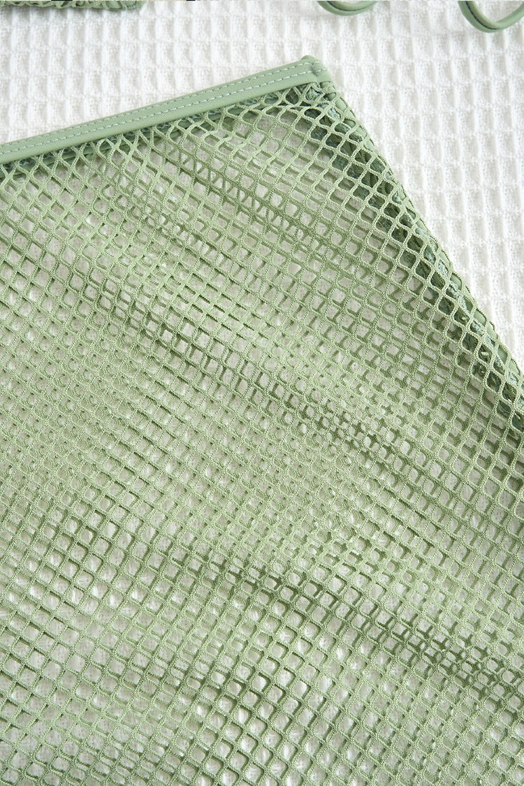 - Gornji dio kupaćeg kostima ima odvojivu podstavu i trokutaste košarice. Donji dio ima udoban kroj, a suknja ima kratku duljinu i podesive vezice s obje strane.
