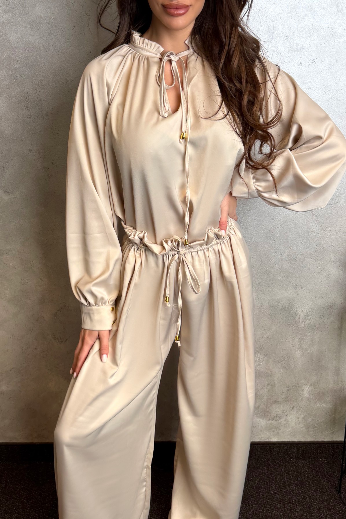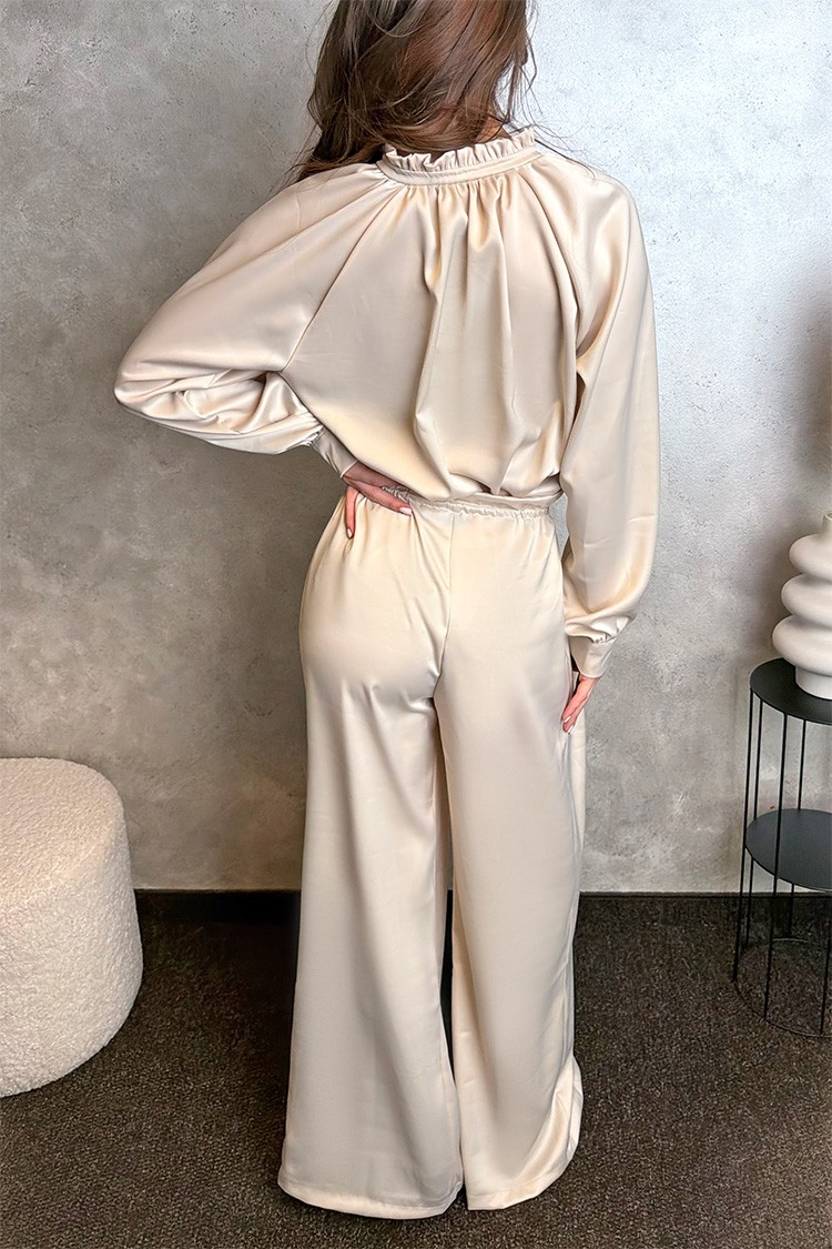 - Gornji dio je bluza s elegantnim dizajnom, klasičnim dekolteom, dugim rukavima i oversized krojem.