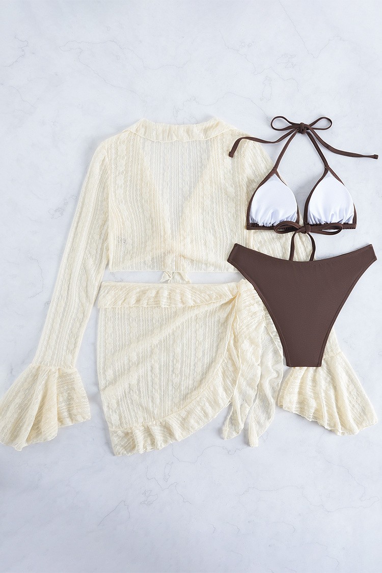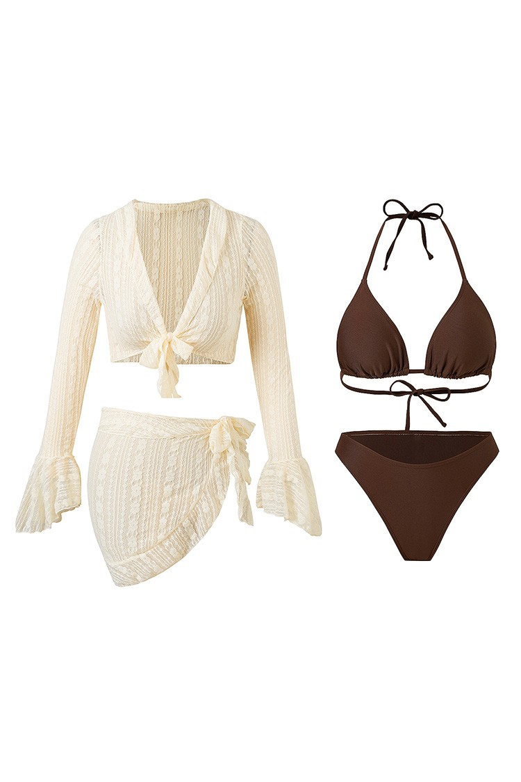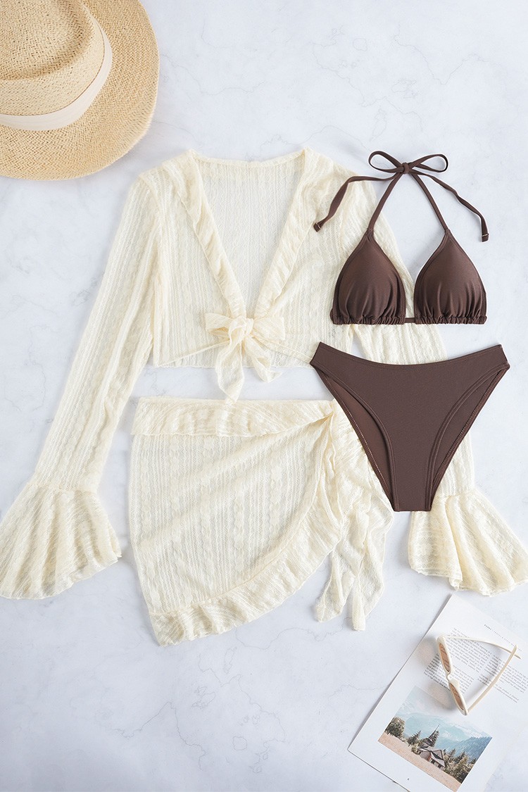 - Moderan set za plažu koji uključuje dvodijelni kupaći kostim, rukave i pareo.