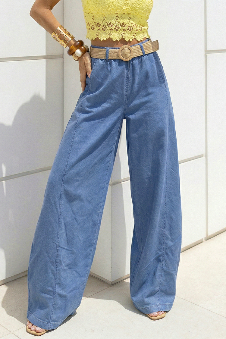- Model ima visoki struk, široki kroj, džepove, svijetloplavi uzorak i remen.