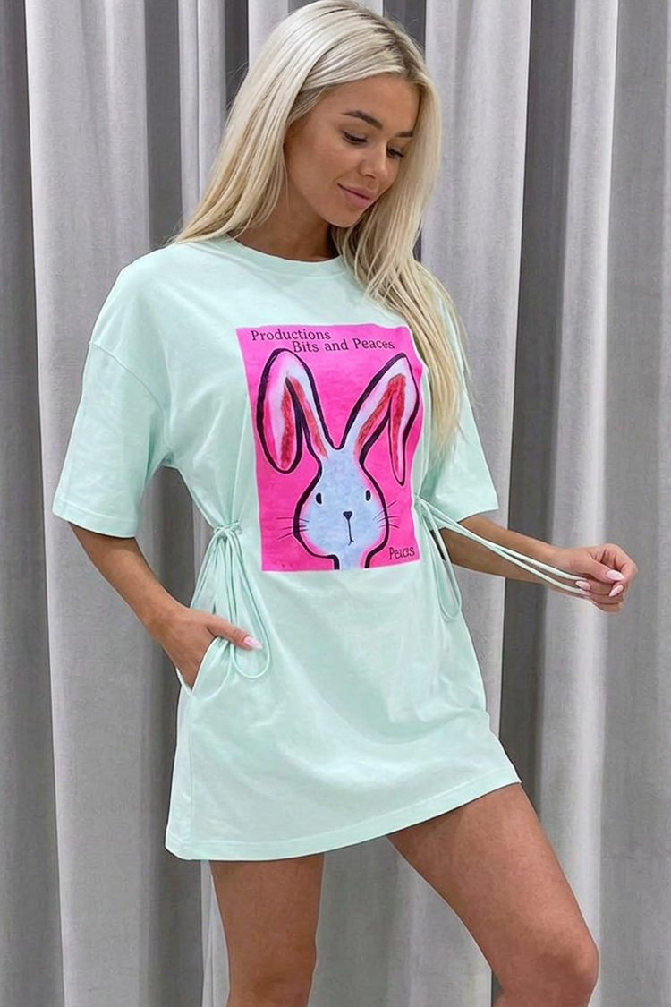 - Model ima oversized kroj, kratke rukave, moderan print zeca, klasični okrugli izrez i džepove.