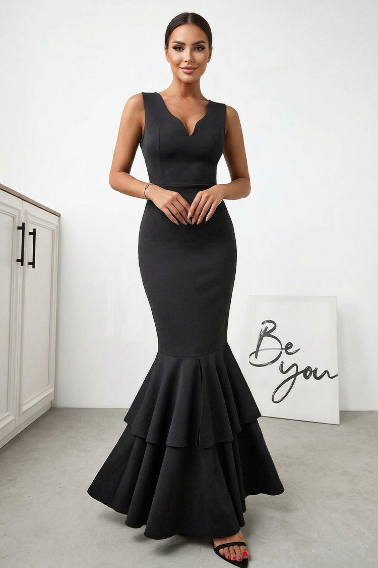 - Model ima kroj sirene, elegantne volane, uski kroj, V-izrez i crnu boju.
