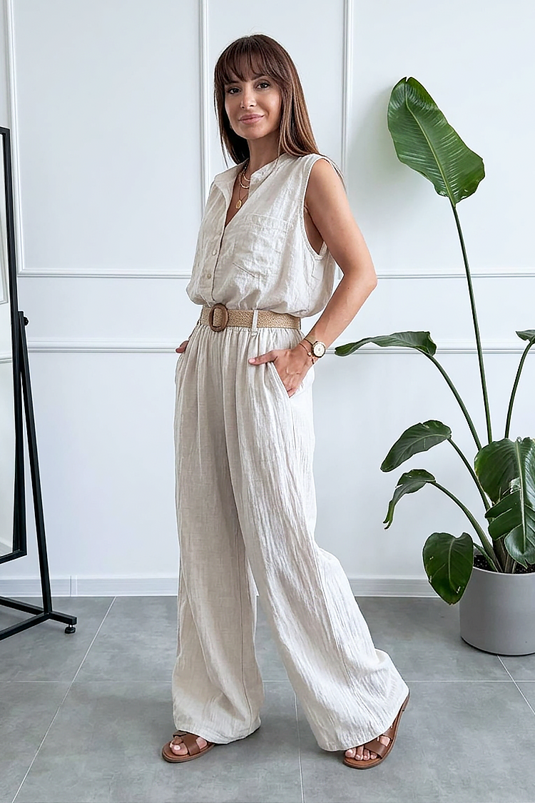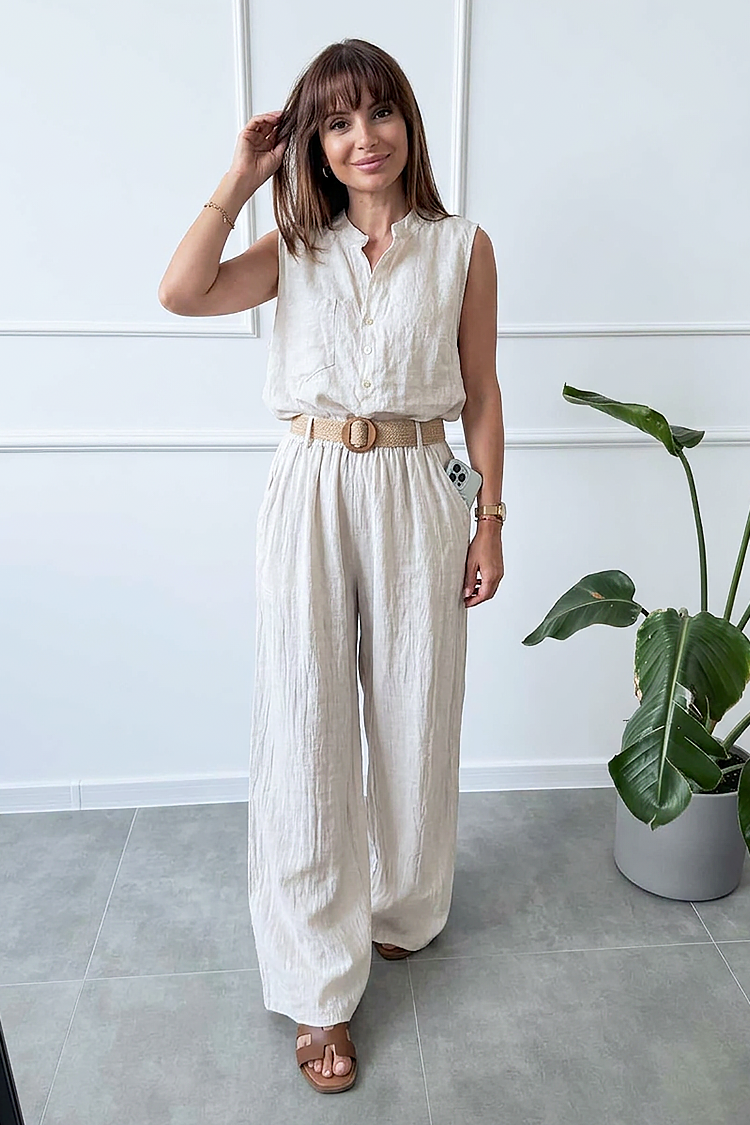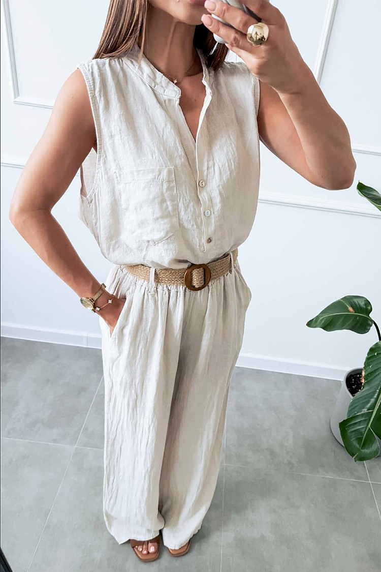 - Ženska košulja širokog kroja, bez rukava i s gumbima cijelom dužinom, pruža udobnost i eleganciju.