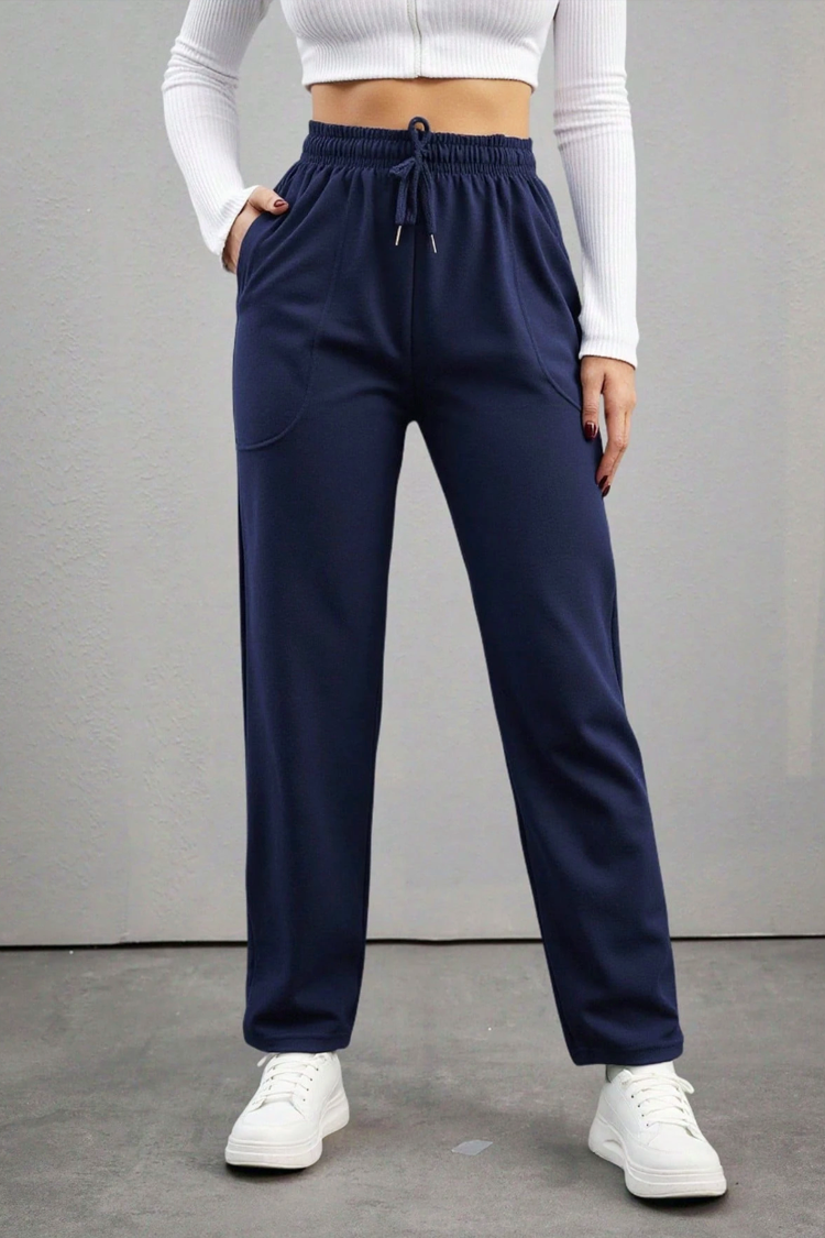 - Model ima visoki i elastični struk s vezicama, bočnim džepovima i tamnoplavom bojom.