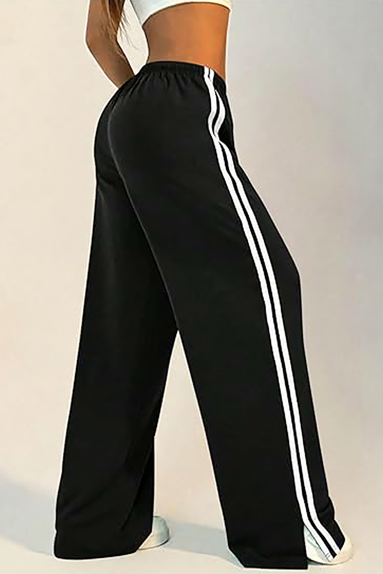 - Model ima srednje visok i elastičan struk s vezicama, crne boje, širok kroj i bijele detalje sa strane.