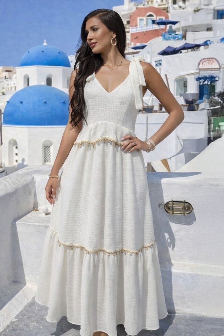 - Haljina ima udoban i širok kroj, naramenice s vrpcama, V-izrez, volane i prošireni kroj.