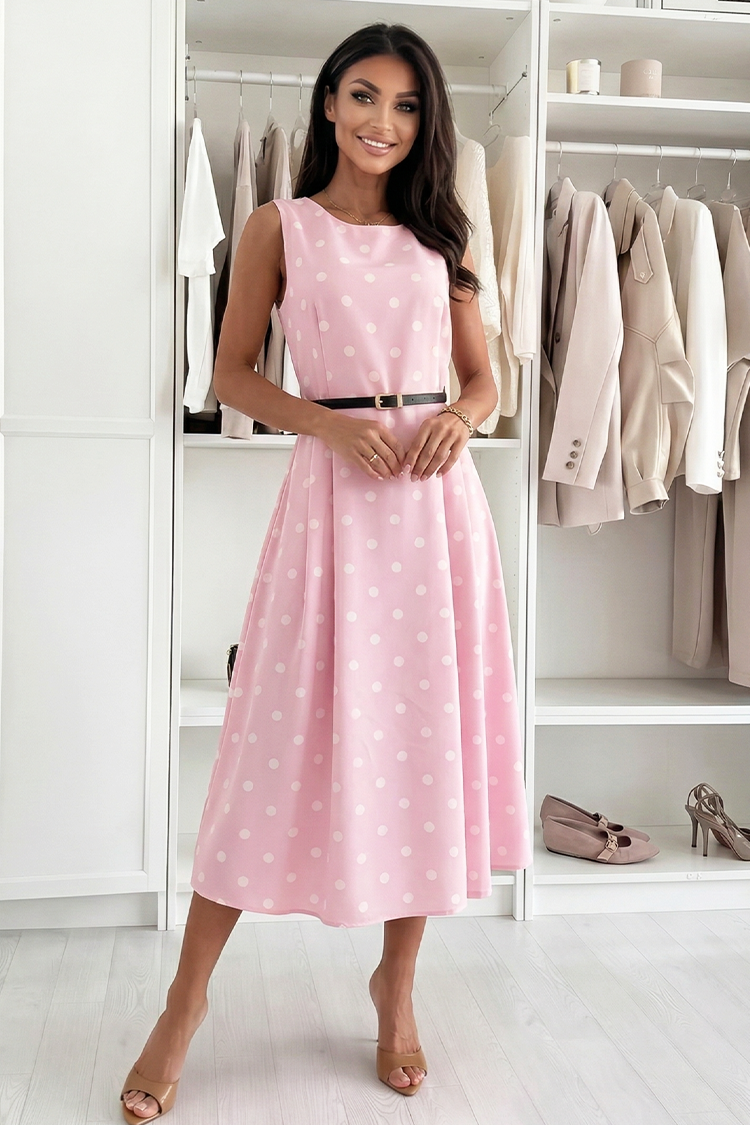 - Model ima rašireni kroj, točkasti uzorak, mint boje, okrugli izrez i midi duljinu.