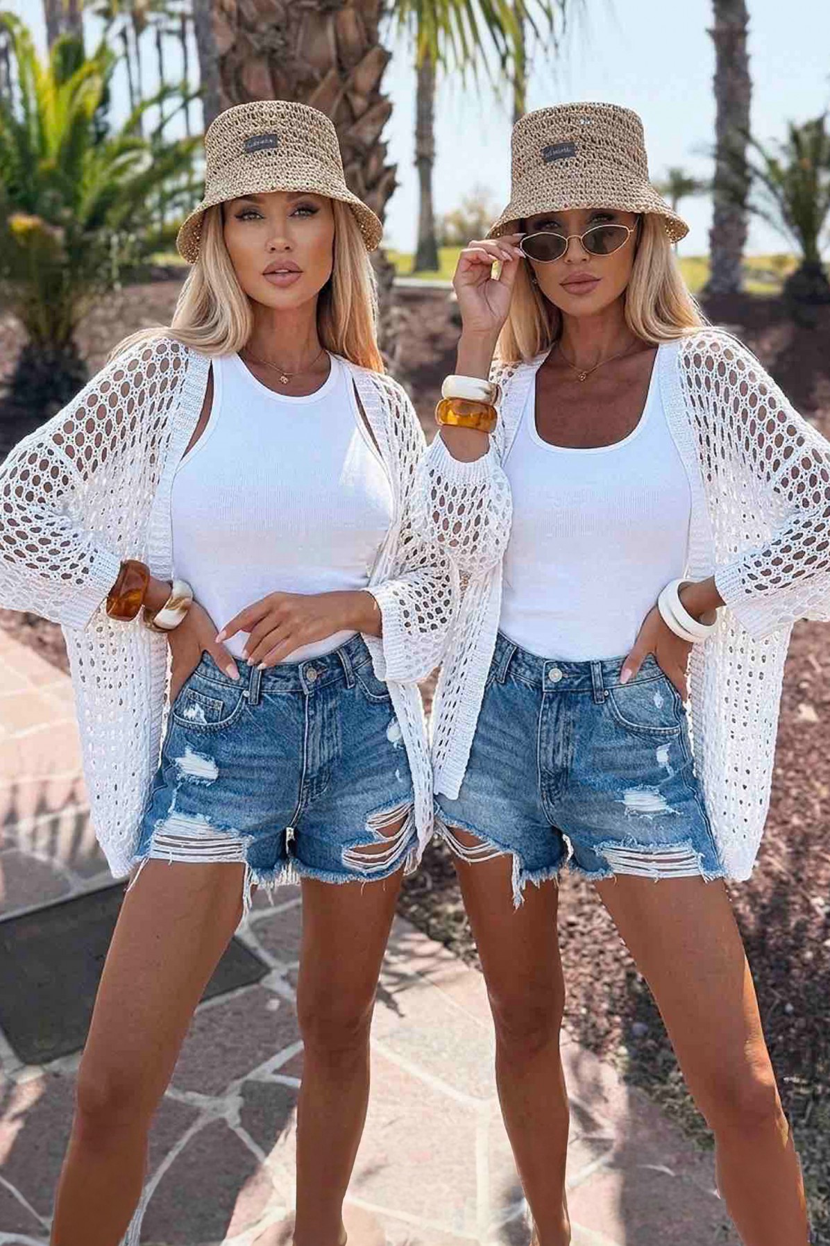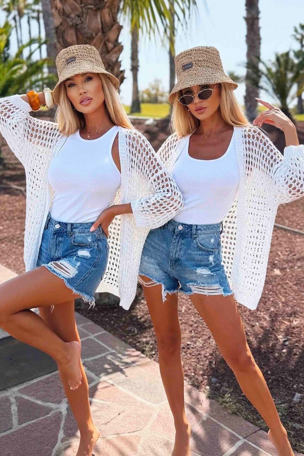- Spektakularni ženski kardigan izrađen od mrežaste tkanine i bijele boje - savršen za moderne i plažne izglede.