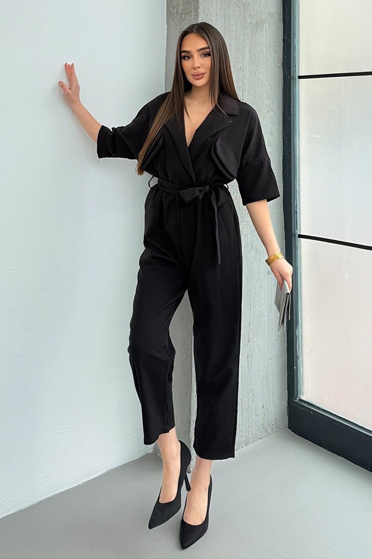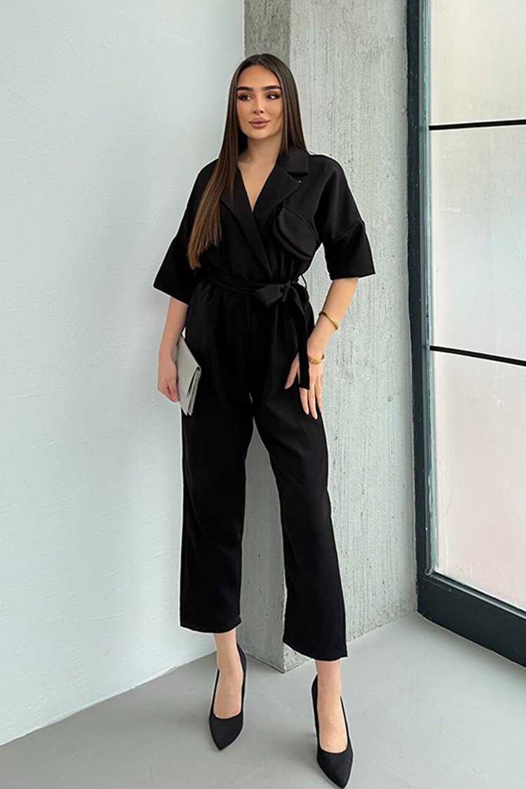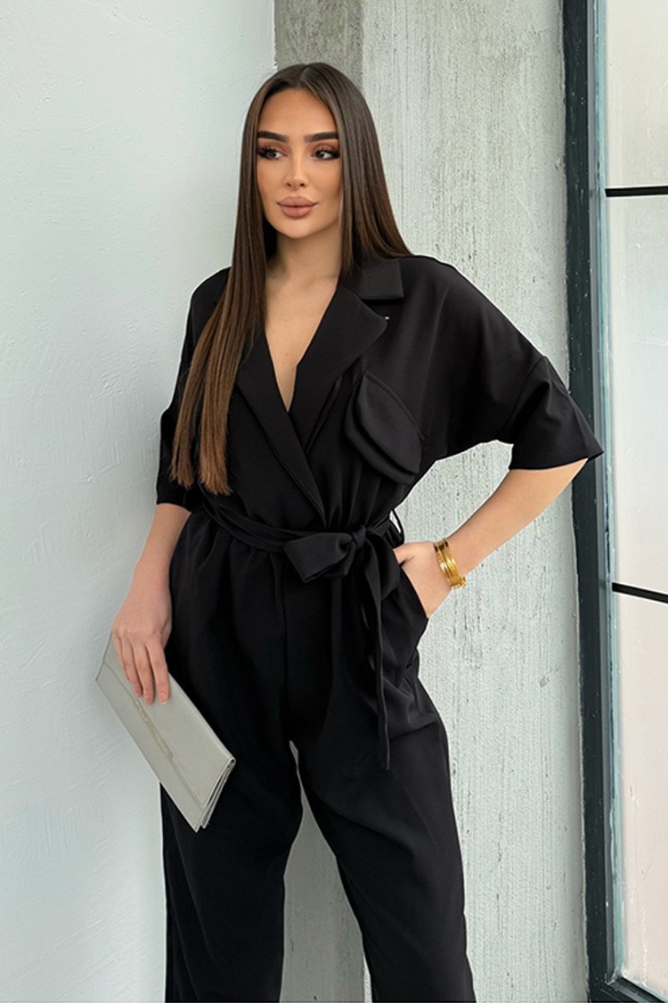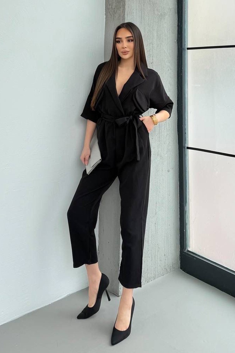 - Model ima trendi dizajn, elegantan ovratnik, crnu boju, bočne džepove, kratke rukave i remen od iste tkanine.