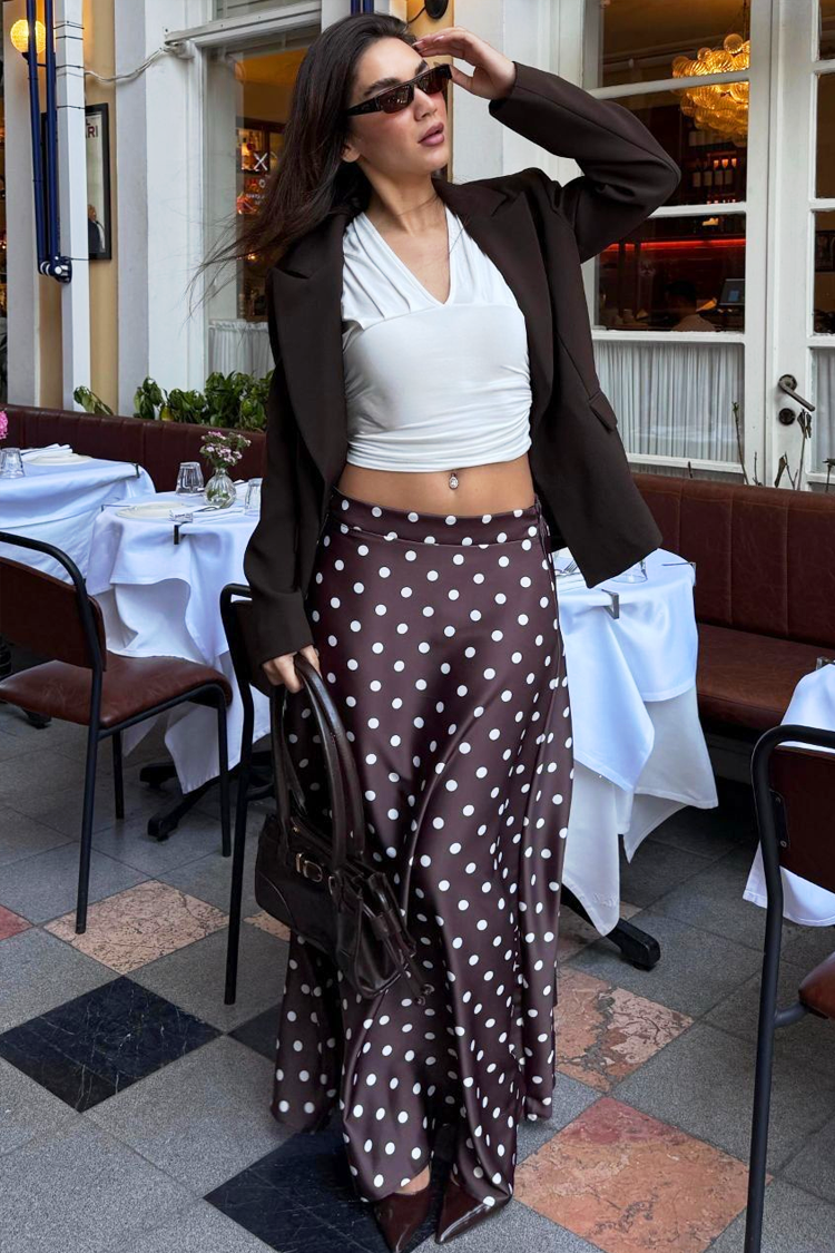 - Model ima prošireni dizajn, srednje visoki struk, točkasti uzorak i smeđu boju.