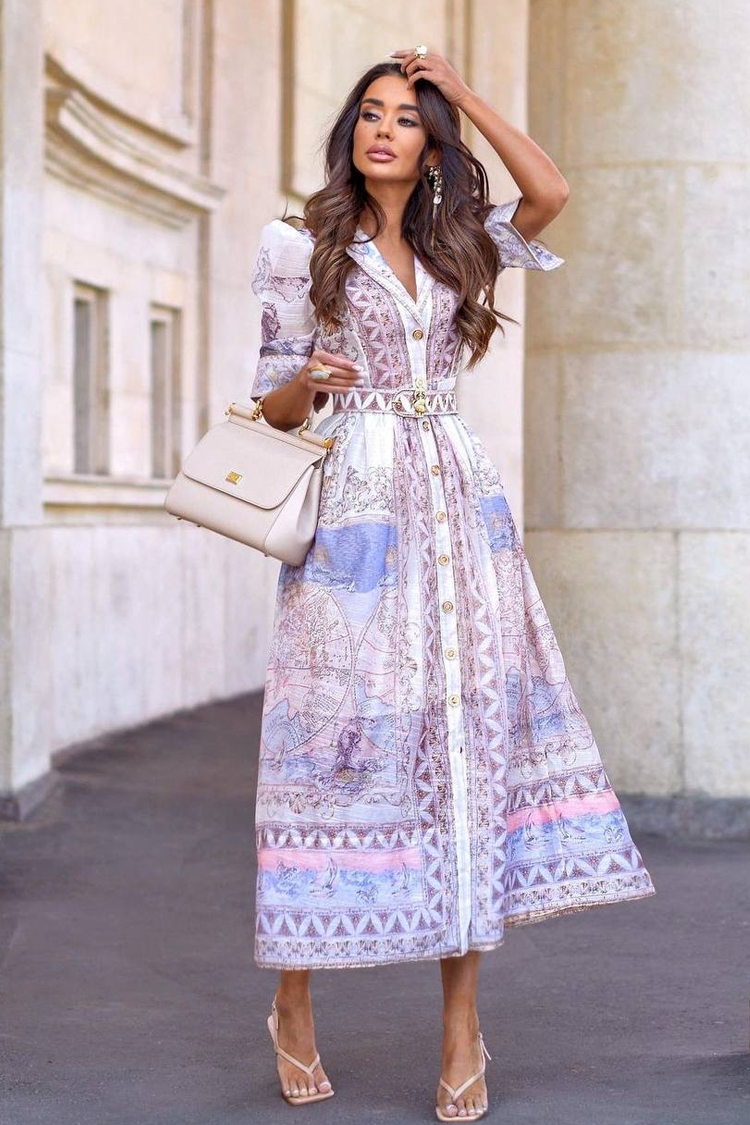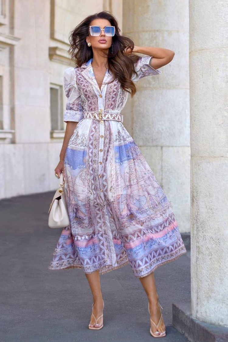 Uska silueta i remen u struku naglašavaju figuru, tvoreći elegantnu i ženstvenu liniju. Spektakularni print daje svježinu i jedinstven karakter modelu. Model je stvoren za dame koje vole izgledati sofisticirano kako u urbanom okruženju, tako i u posebnim prilikama.
