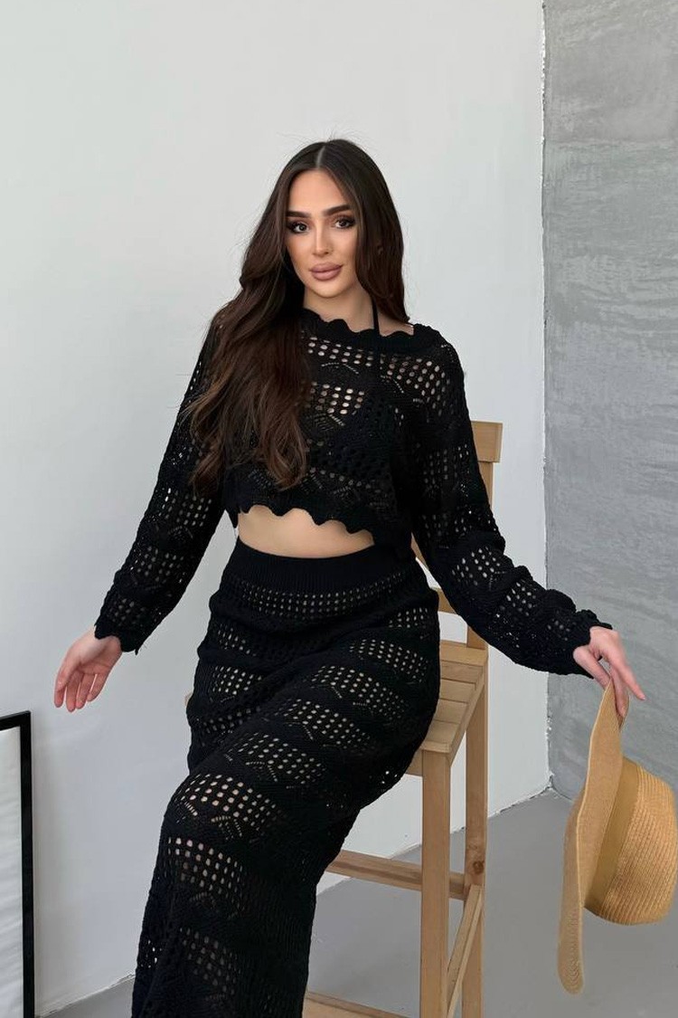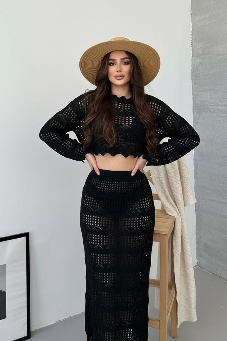 Crop top dugih rukava i valoviti rub dodaju moderan naglasak, dok suknja visokog struka oblikuje figuru i naglašava obline na elegantan način.