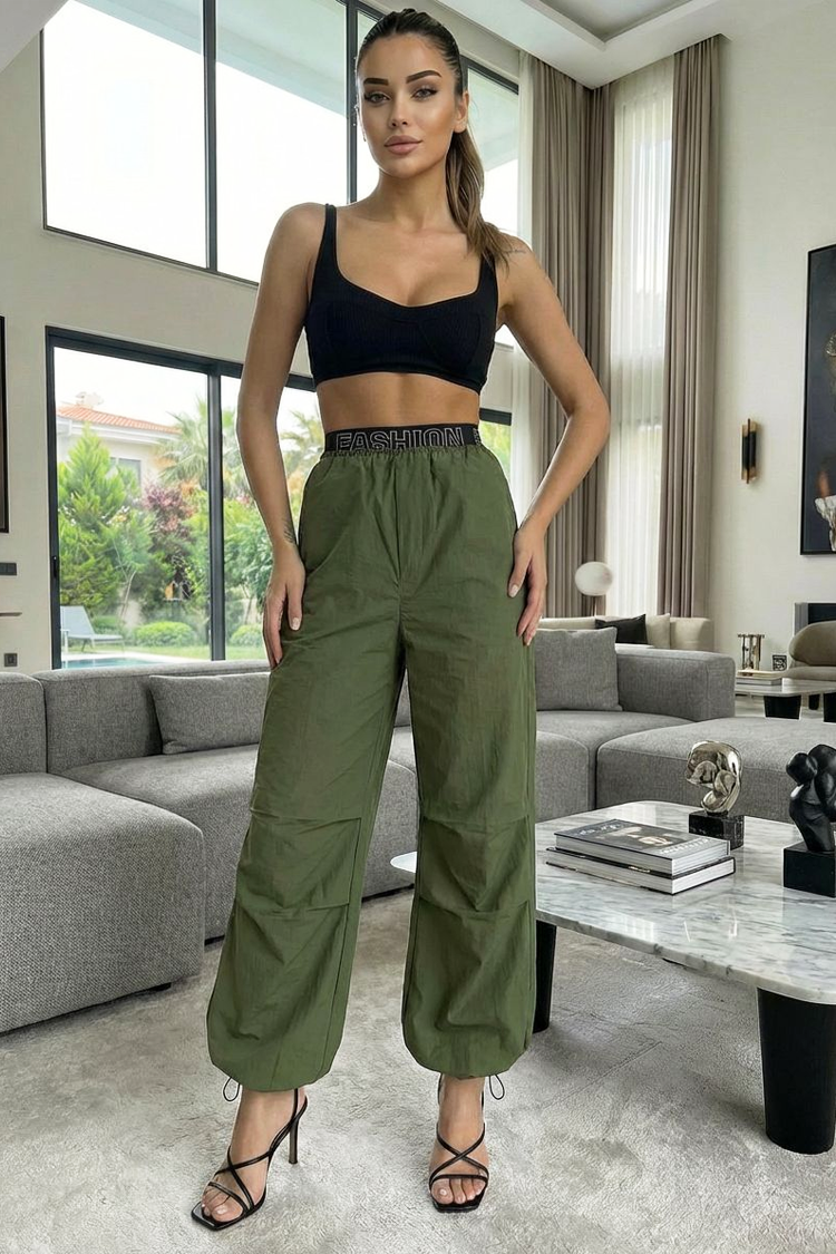 Kombinira visoki struk i široki elastični remen s natpisom "FASHION", koji naglašava figuru i daje zaokružen, moderan naglasak.