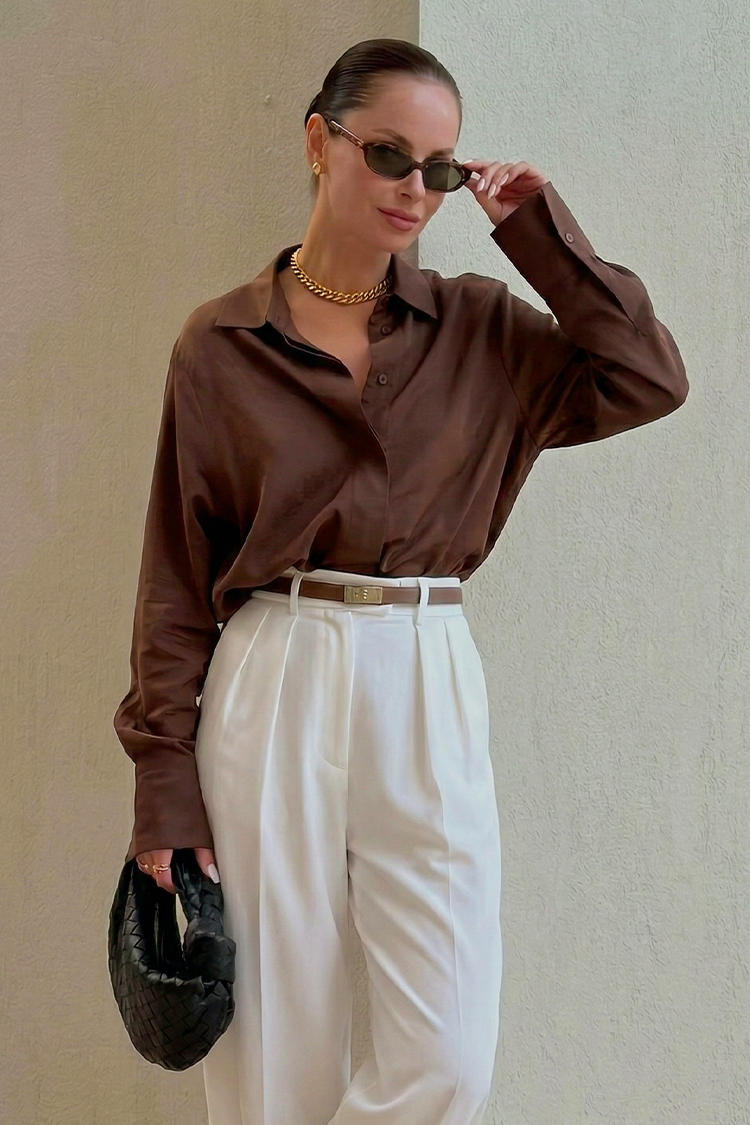- Ova satenska košulja dizajnirana je za ženu koja želi izgledati samouvjereno, elegantno i besprijekorno u svakoj radnoj situaciji. Fina satenska tkanina dodaje prirodni sjaj i sofisticiranost. Mekani pad tkanine osigurava cjelodnevnu udobnost, bilo da ste u poslovnom okruženju, na sastancima ili u pokretu.